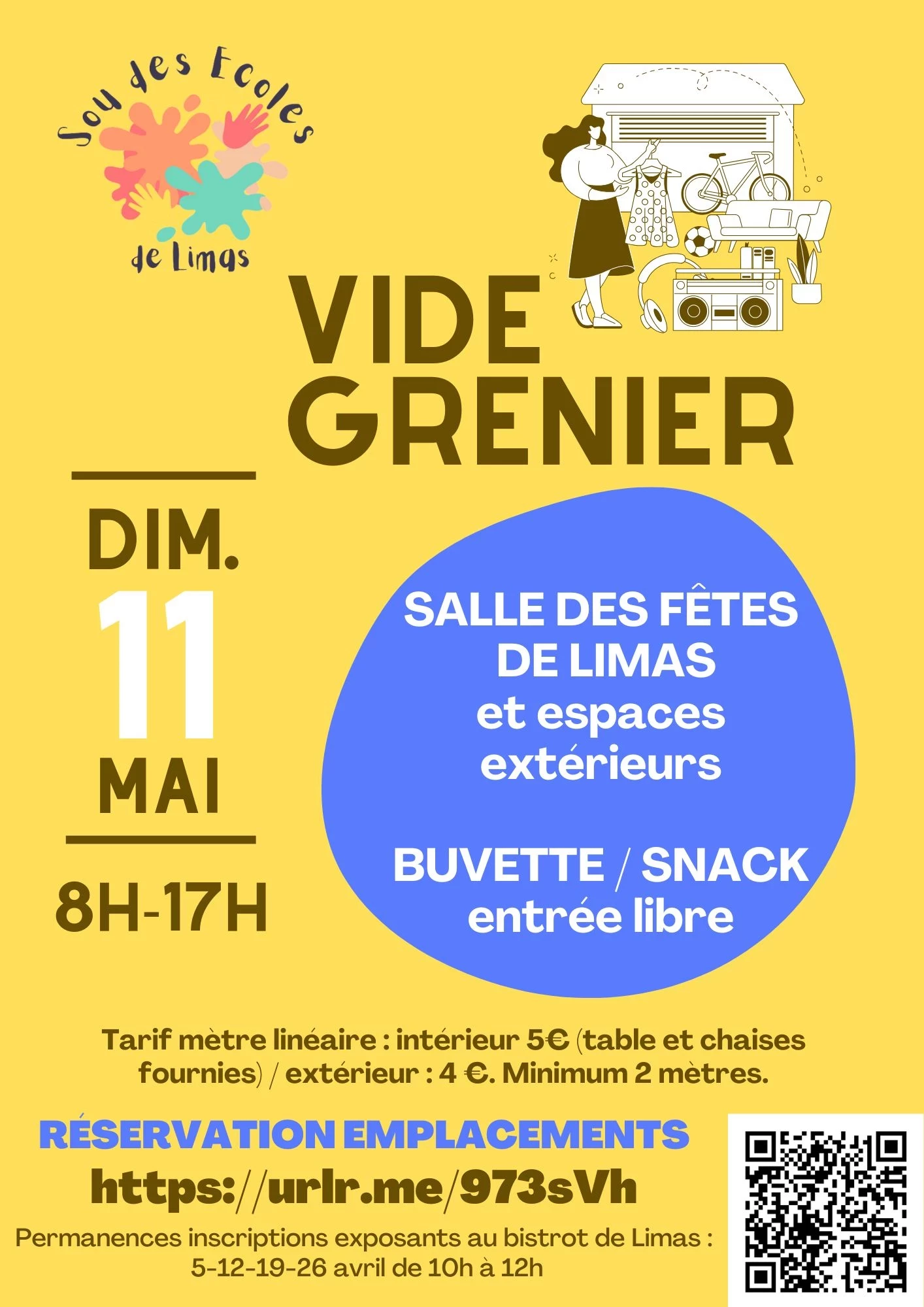 Inscriptions par helloasso (https://www.helloasso.com/associations/sou-des-ecoles-limas/boutiques/vide-grenier) ou par bulletin à déposer au bistrot de Limas lors des permanences (demander un bulletin à soudesecolesdelimas@gmail.com).
